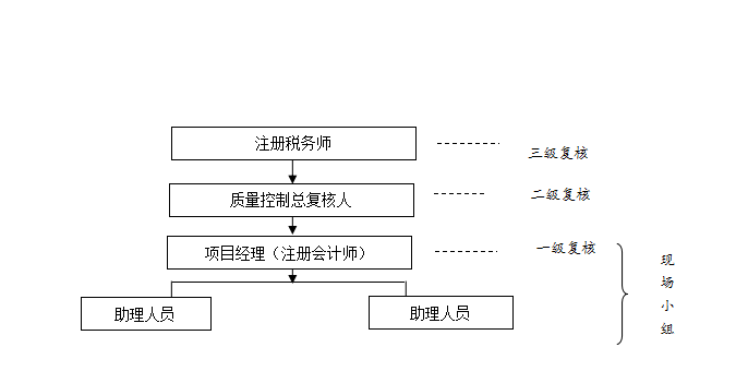 根據項目具體情況,由各種專業(yè)人員組成項目服務工作組,根據情況分配到工作組,每組具體審核人員由注冊稅務師1名擔任項目經理,并由財務專業(yè)人員2名擔任助理,并經主任稅務計師、質量控制總復核人和項目負責人三級復核,嚴把質量關。項目組成員根據組內分工履行工作職責,互相配合完成服務事項。